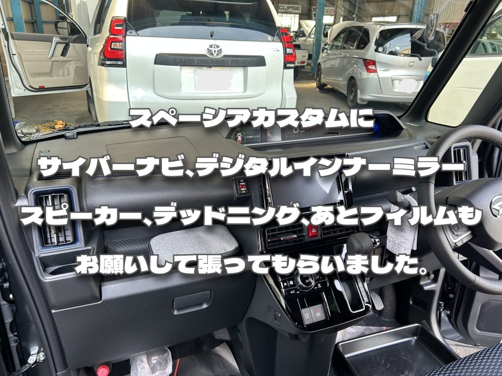 スペーシアカスタムにサイバーナビ、デジタルインナーミラー、スピーカー、デッドニング、あとフィルムもお願いして張ってもらいました。