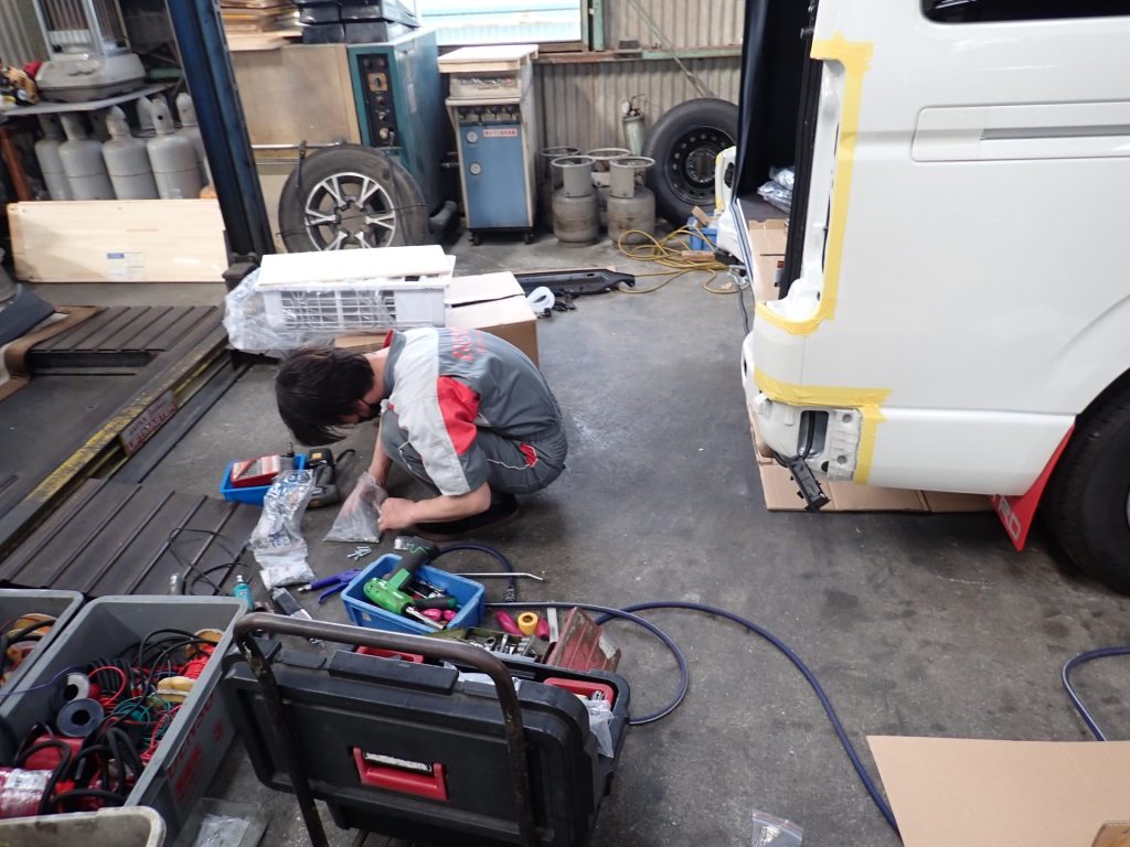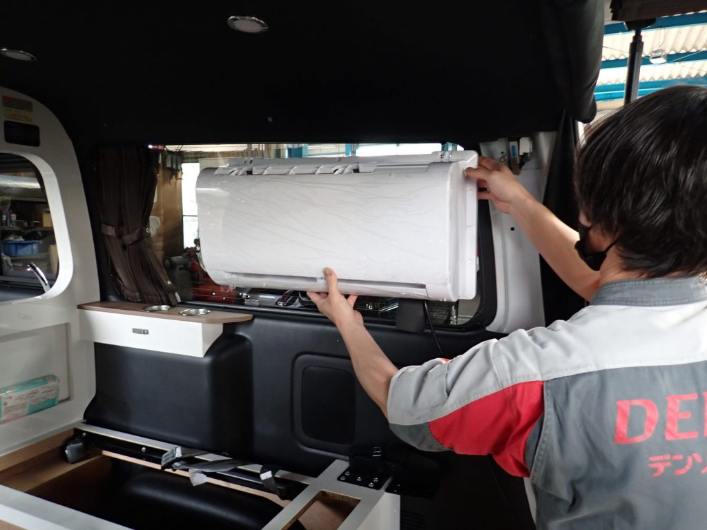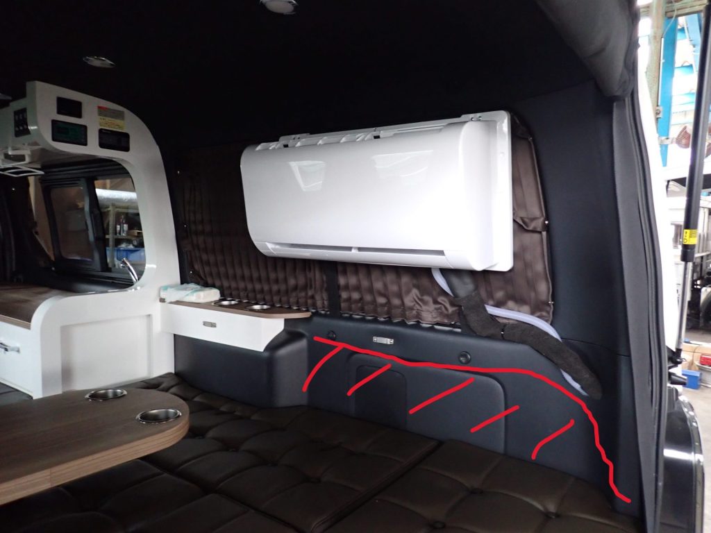 既設家具はもちろんのこと、ギリギリまで敷き詰められたマットは困ることが多い。12Vクーラーをハイエースに取付