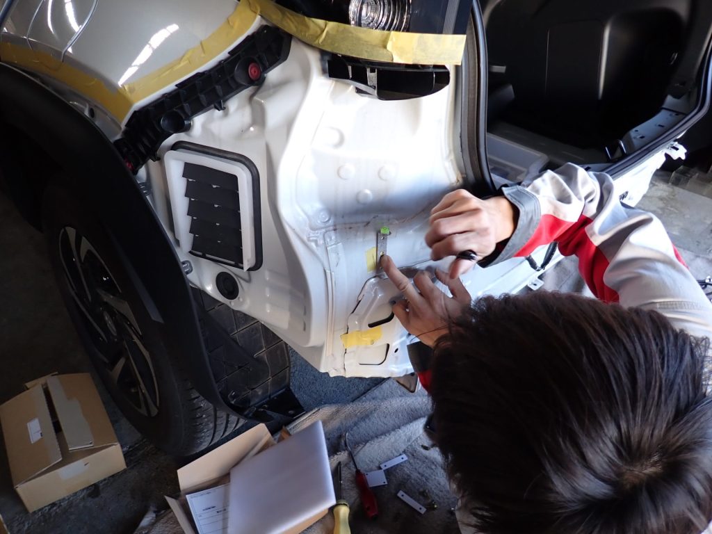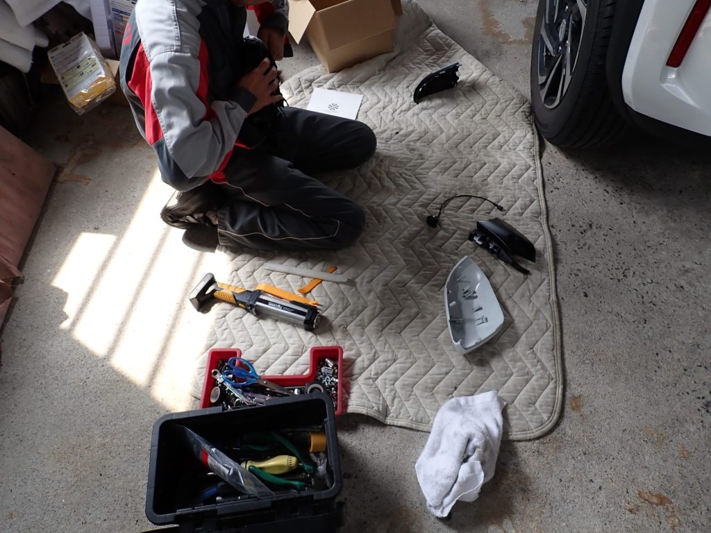 ひとまず、現在のミラーで社外アラウンドカメラを取り付ける穴を開けます。