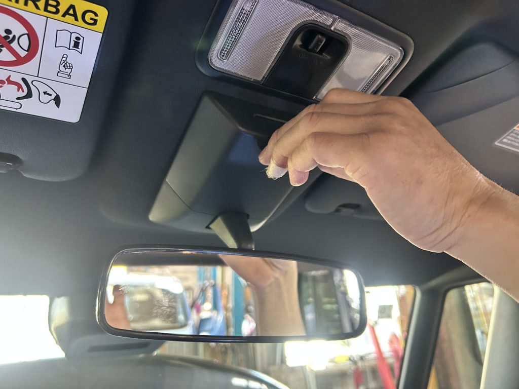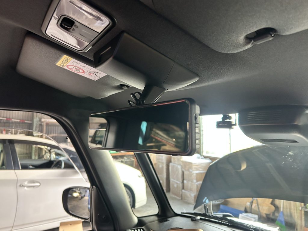 デジタルインナーミラーは、フロントガラスにカメラを取り付けたうえで、デジタルインナーミラーまで配線を引っ張る必要があるため。どれだけ配線をキレイにできるか、腕の見せ所。