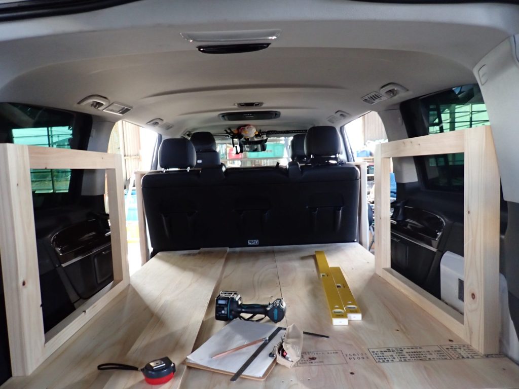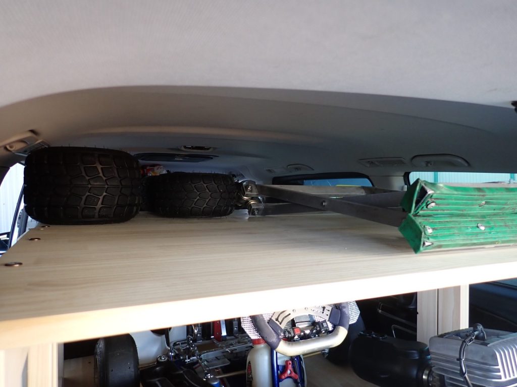 今回は後部座席に重ねるように作る棚と、荷室の部分に作るゴーカート用棚を製作します。
