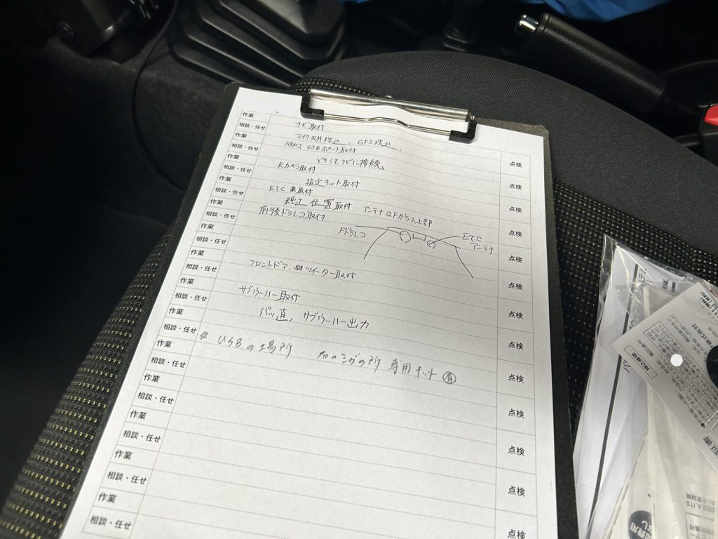 細かな指定はあれど、ナビ、前後ドラレコ、リアカメラ、ETCなど。基本中の基本の作業ですからね。