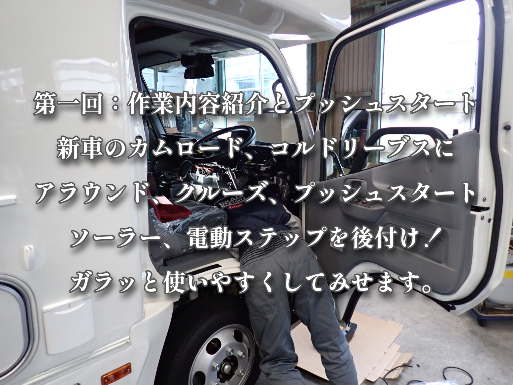 第一回:作業内容紹介とプッシュスタート 新車のカムロード、コルドリーブスにアラウンド、クルーズ、プッシュスタート、ソーラー、電動ステップを後付け!ガラッと使いやすくしてみせます。
