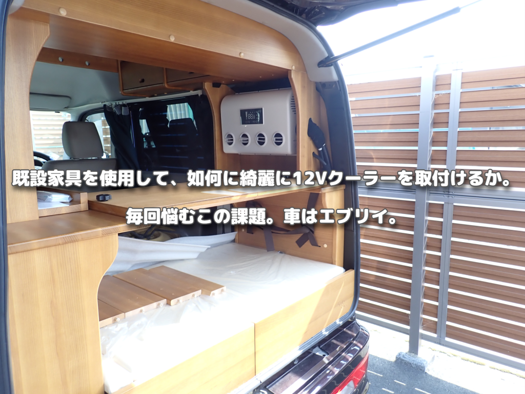 既設家具を使用して、如何に綺麗に12Vクーラーを取付けるか。毎回悩むこの課題。車はエブリイ。