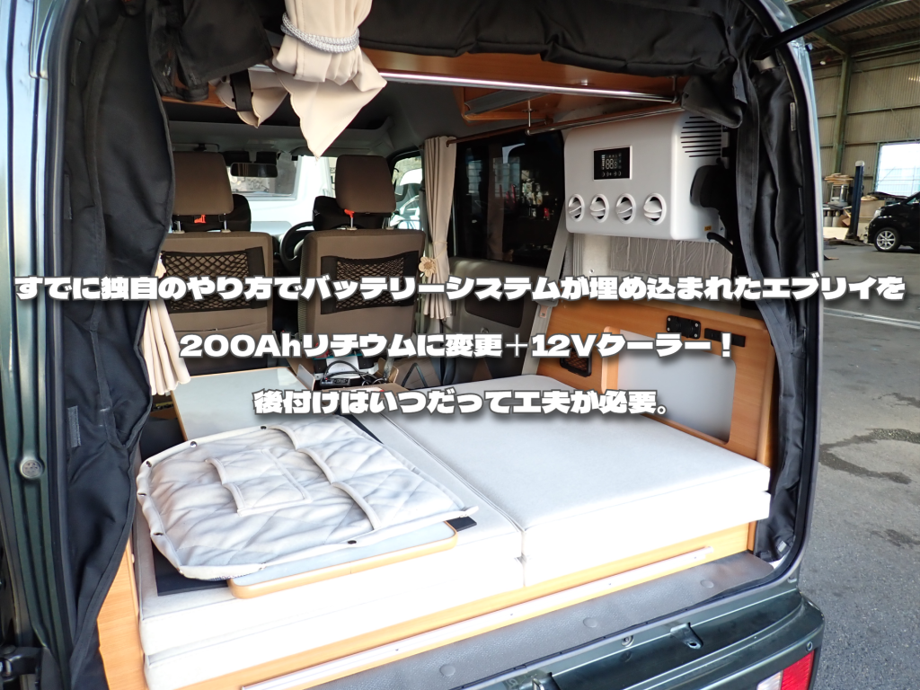すでに独自のやり方でバッテリーシステムが埋め込まれたエブリイを200Ahリチウムに変更+12Vクーラー!後付けはいつだって工夫が必要。
