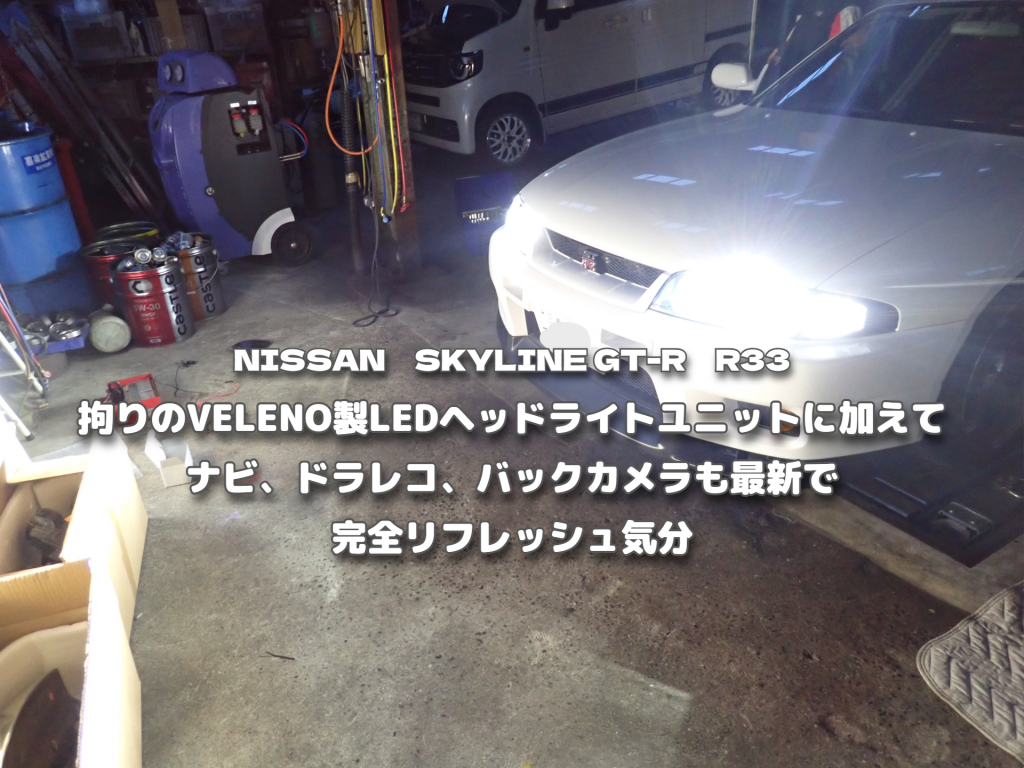 スカイラインGT-R、R33にVELENOのLEDヘッドライトユニット(←なんかすごい^^)取付と新型ナビ、前後ドラレコ取付!
