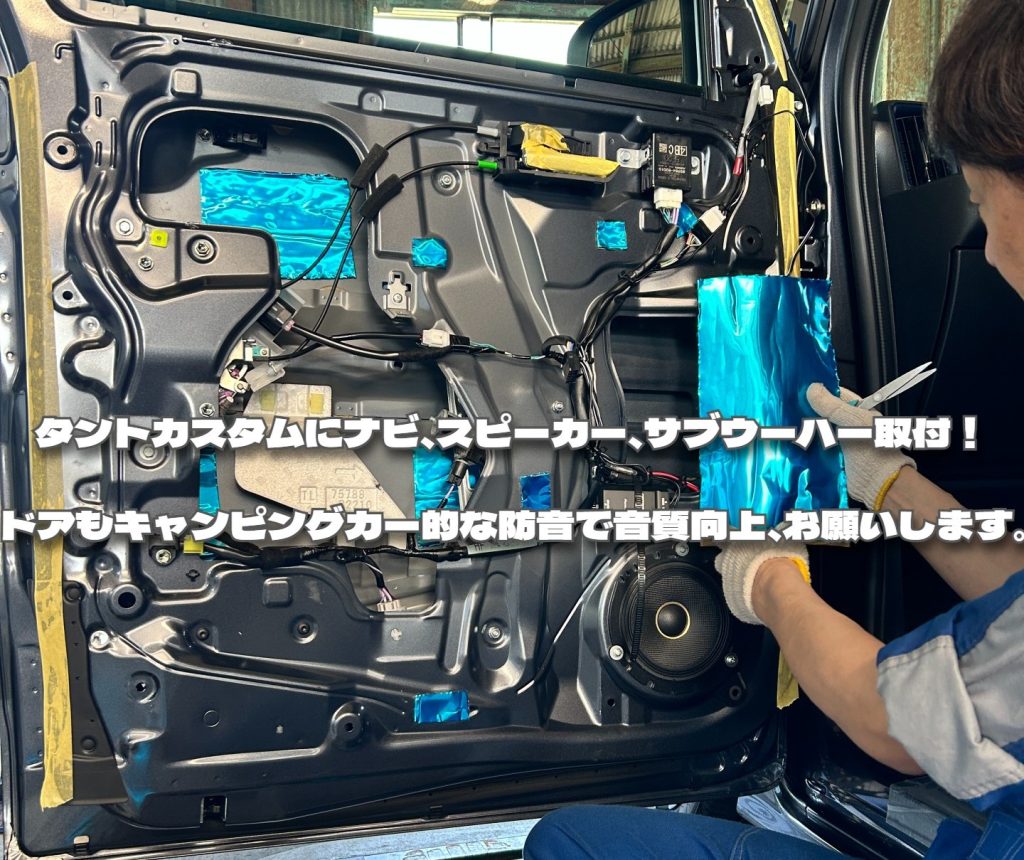 タントカスタムにナビ、スピーカー、サブウーハー取付!ドアもキャンピングカー的な防音で音質向上、お願いします。